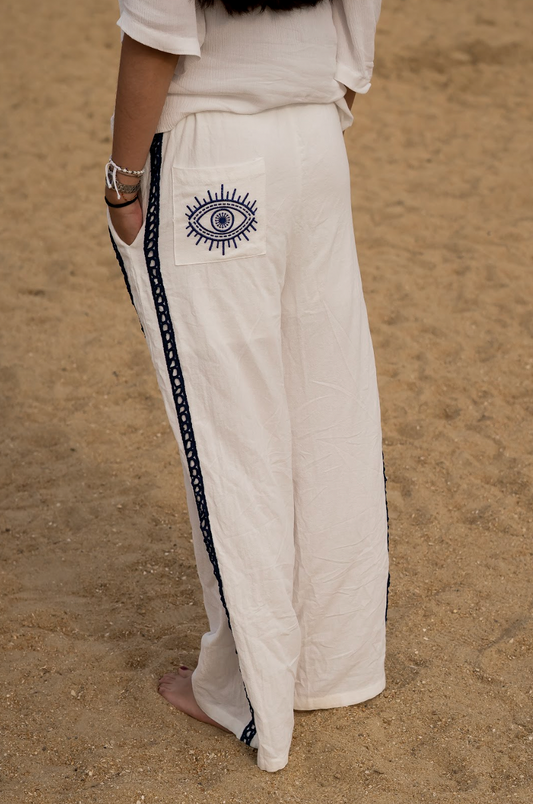 目の刺繍とサイドライン入りの白いワイドパンツ