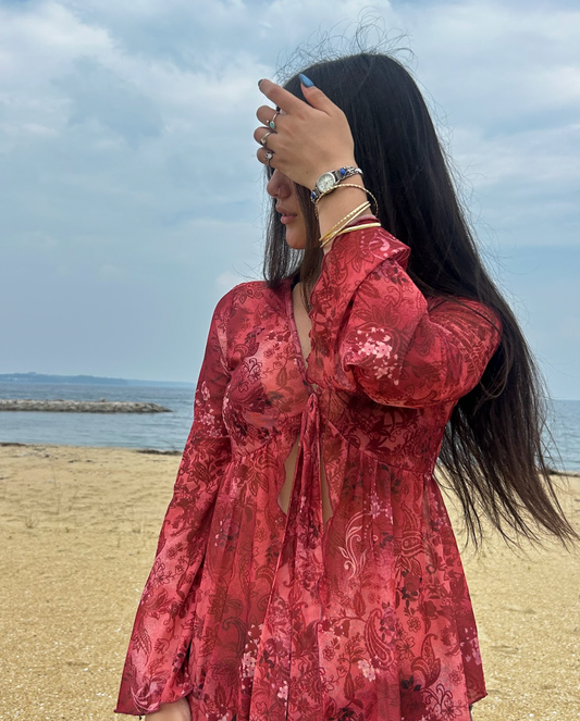 ベルスリーブ付き花柄シアーメッシュブラウス