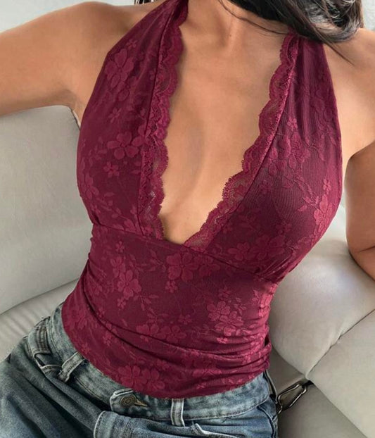 バーガンディレースホルターVネックトップ