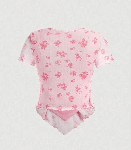半袖アシンメトリー花柄トップス