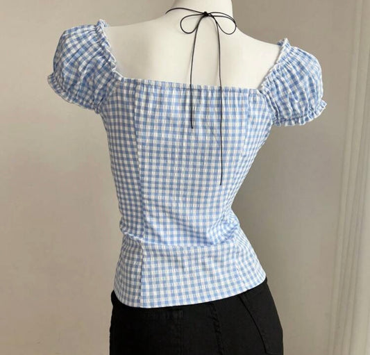 Blue Gingham Ruffle With Puff Sleeves Shirt