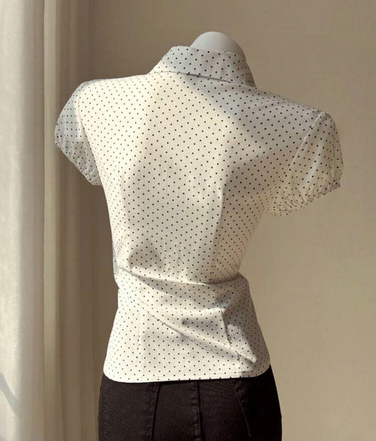 Fitted Short-Sleeve Polka Dot Blouse